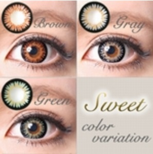 ラブコンカラコンの中でも、最大級の着色直径16mmを誇るのが、スウィート(Sweet)シリーズだよ。目もとをパッチリと演出してくれる、グラデーションの、3トーンカラーで着色されてて、しっかりした黒ふちもあるから、デカ目効果もばっちり!ナチュラルさには、少し欠けるけど、目力がUPして、印象的な愛らしい、くりっと大きな瞳を楽しむことが出来るの。3トーンの着色がされているから、奥行きのある、リアルなハーフフェイスを楽しめちゃうし、レンズの着色直径が大きいから、しっかり瞳に色をのせられるのも魅力的!グラデーション着色がされているから、自然に瞳に馴染み、手軽になりたい自分へと、印象を変える事ができちゃうよ。つけ心地が良くて、もちろん、度あり、度なしも展開してるし、最長で6ヶ月使用可能なのに、レンズ2枚3480円という安さなの。ラブコンカラコンスウィート(Sweet)のカラバリは、ブラウン、グレー、グリーンの3色の展開。下記で詳しく紹介するね。